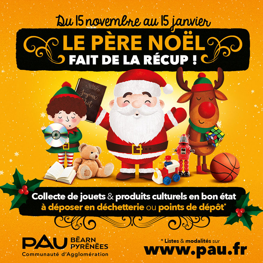 Dans un contexte économique difficile, une belle opération d'écocitoyenneté est lancée à Pau.  En effet, du 15 Novembre au 15 Janvier 2022, une collecte de jouets et de produits culturels est réalisée dans vos décheteries municipales et/ou points de dépot. Renseignements et modalités complémentaires disponible sur www.pau.fr